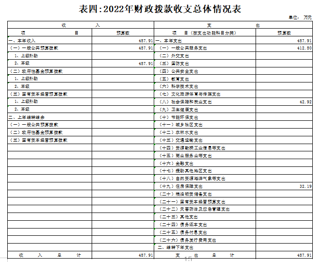 2022年收入总预算487.91万元,同比减少94.21万元,下降19%。增减主要原因:自治县乡村振兴指挥部工作经费减少40万元,及所有项目资金压减。