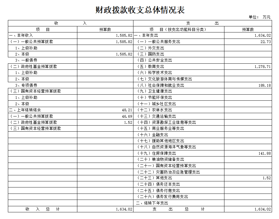 2023年预算收入总计1634.02万元。其中:公共财政预算拨款1585.82万元,同比增加59.51万元,增长3.9%。上年结转结余收入48.21万元,同比增加48.21万元。